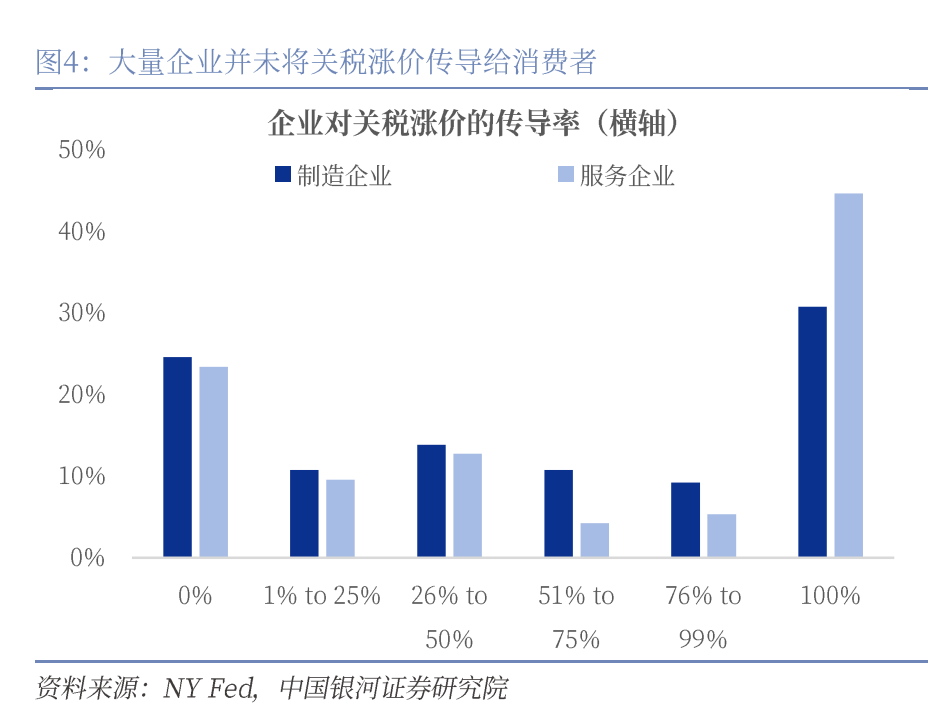 经济数据中,美联储短期依然在劳动市场暂时稳定的情况下强调通胀上行的风险,但我们认为最终促成降息的依然将是消费的走弱和失业率的上升:在FOMC声明中,对于劳动市场的评估是“失业率保持低位”,且鲍威尔表示劳动需求虽然在下滑,但供给也有所减少,这有利于使失业率保持相对稳定。不过,从近期数据来看,失业率事实上一直在小幅稳定增长;此外,劳动需求的下行似乎仍快于劳动供给的放缓,这在职位空缺数据相对快速的下滑与非本地出生劳动人口和工作许可申请数量保持稳定中都可以看到。相比之下,美联储虽然短期强调通胀,但从数据预测中不难看出到2026年通胀依然将降至2.5%以下。假设能源价格不再因地缘政治问题大幅上行,通胀自身并没有持续深化的动力;同时研究也显示,除了商品涨价向CPI传导滞后外,大量企业也承担了部分涨价,这使得通胀的“一次性”涨幅也较为可控。从SEP的通胀预测来看,美联储并非真的判断通胀上行具有粘性。