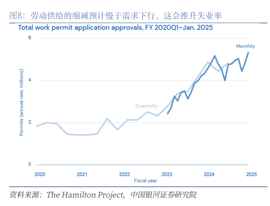 (3)经济数据中,美联储短期依然在劳动市场暂时稳定的情况下强调通胀上行的风险,但我们认为最终促成降息的依然将是消费的走弱和失业率的上升。在FOMC声明中,对于劳动市场的评估是“失业率保持低位”,且鲍威尔表示劳动需求虽然在下滑,但供给也有所减少,这有利于使失业率保持相对稳定。不过,从近期数据来看,失业率事实上一直在小幅稳定增长;此外,劳动需求的下行似乎仍快于劳动供给的放缓,这在职位空缺数据相对快速的下滑与非本地出生劳动人口和工作许可申请数量保持稳定中都可以看到。相比之下,美联储虽然短期强调通胀,但从数据预测中不难看出到2026年通胀依然将降至2.5%以下。假设能源价格不再因地缘政治问题大幅上行,通胀自身并没有持续深化的动力;同时研究也显示,除了商品涨价向CPI传导滞后外,大量企业也承担了部分涨价,这使得通胀的“一次性”涨幅也较为可控。所以,我们倾向于将美联储对通胀的担忧理解为预期管理,从SEP的通胀预测来看,美联储并非真的判断通胀上行具有粘性,在通胀可控的情况下,未来消费和失业率恶化的程度才是影响美联储决策的关键。