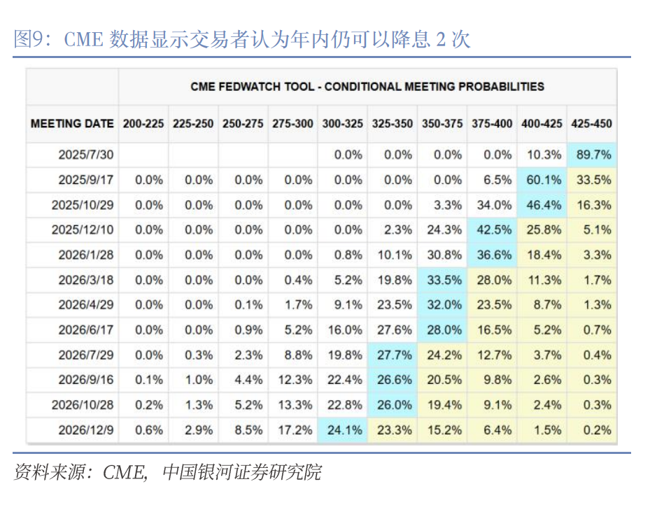 市场将本次会议理解为边际鹰派,美元资产短期继续震荡:市场对于本次议息会议的理解似乎稍偏鹰派,但也未导致资产价格明显动荡。CME数据显示,联邦基金利率期货交易者的降息预期整体稳定,仍认为2025年9月和12月出现累计50BP的降息,但2026年3次的降息预期高于美联储的指引。美国三大股指整体震荡,在FOMC会议和鲍威尔答记者问后有所下行。美债收益率回升,10年期美债收益率在FOMC会后由4.346%的日内低点回升至4.393%;2年期美债收益率基本不变,保持3.941%,支持年内两次降息。中短端收益率稳定而长端小幅回升的姿态也与点阵图传达的2026年降低幅度压缩较为一致。美元指数也在会后出现回升,从日内98.5左右的低点回升至98.8911。会后美股小幅回落而长债和美元指数略升的情况表明市场认为美联储短期还是在传达偏鹰派的信号。