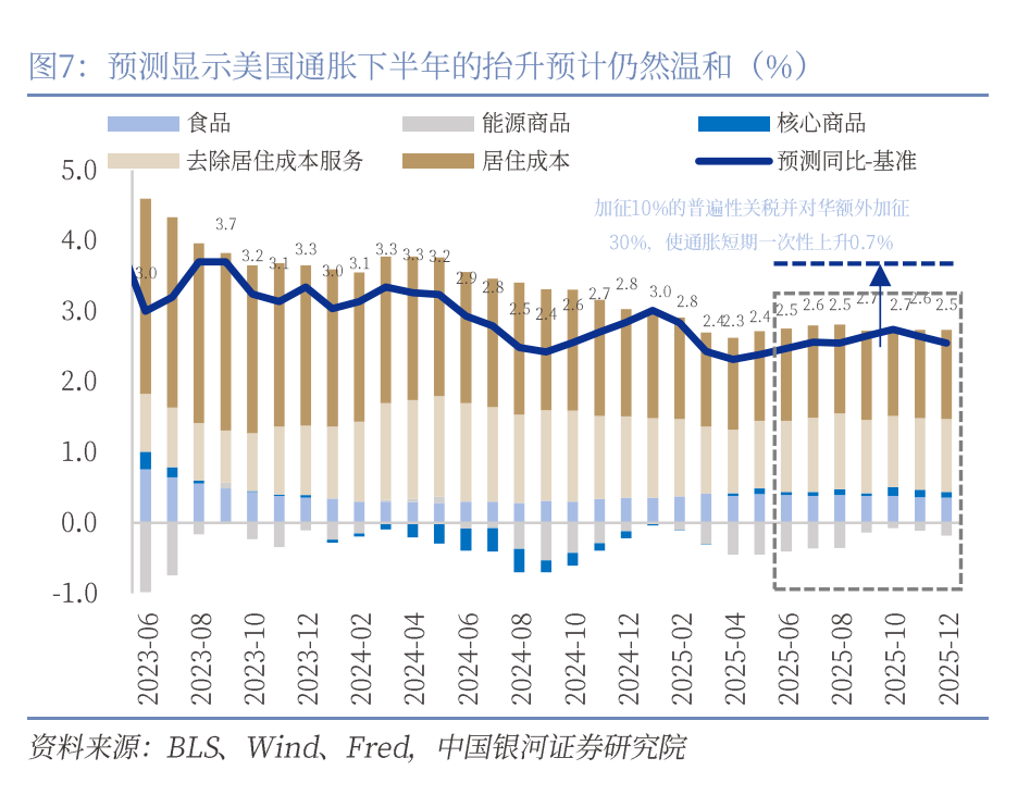 (2)美联储在声明中表示“经济展望的不确定性降低但仍在高位”(Uncertainty about the economic outlook has diminished but remains elevated),并删除了更高失业率和通胀的风险上行的表述,我们理解这美联储认为4、5月关税政策缓和后经济风险降低。在答记者问时,鲍威尔也表示所谓经济不确定性的降低是边际的,即美联储判断4月超预期的对等关税是不确定性的顶峰,此后随着特朗普政府暂缓加征对等关税并与中国缓和贸易冲突,相关的不确定性不会加剧,美国综合关税税率也很难再度提升至20%以上的水平。这也意味着美国2025年的经济虽然有进一步下滑的风险,但并不会陷入衰退。